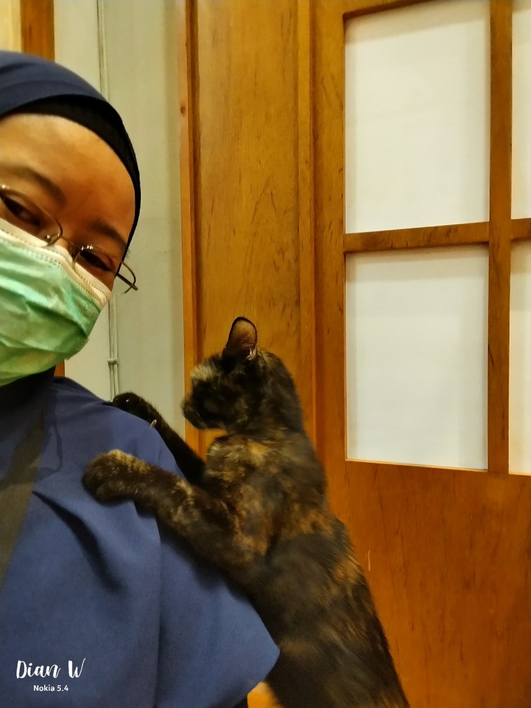 Akhirnya aku cuman duduk aja deket dia. Cakarnya serta merta keluar tapi dia nggak hishing. Kupanggil, “push….come” Sambil tanganku kutepuk ke pangkuanku. Berharap dia mendekat. Eh dia mendekat ke tanganku. Akhirnya kuelus pelang-pelan kepala dan lehernya. Rada takut juga, namanya juga kucing unknown dan rada beringas. Takut ada rabies wkwkwk. Eh btw kucing bisa bawa rabies ato gak sih? Setelah itu, kemana tanganku bergerak, dia ikutin terus, dia tempelin kepalanya ke tanganku. Dia tempelin badannya ke badanku. Nyederin kepala, trus berdiri dan meluk-meluk.