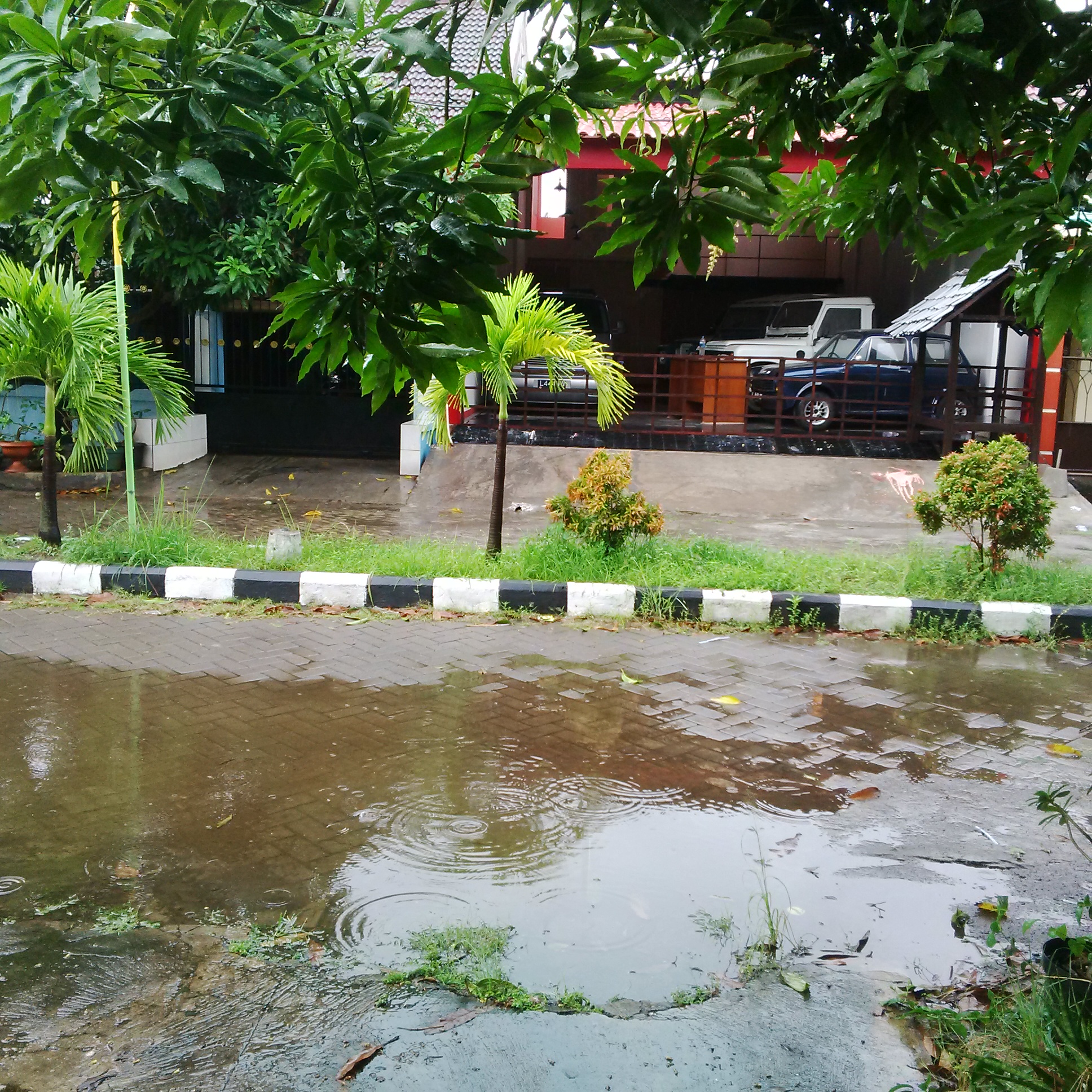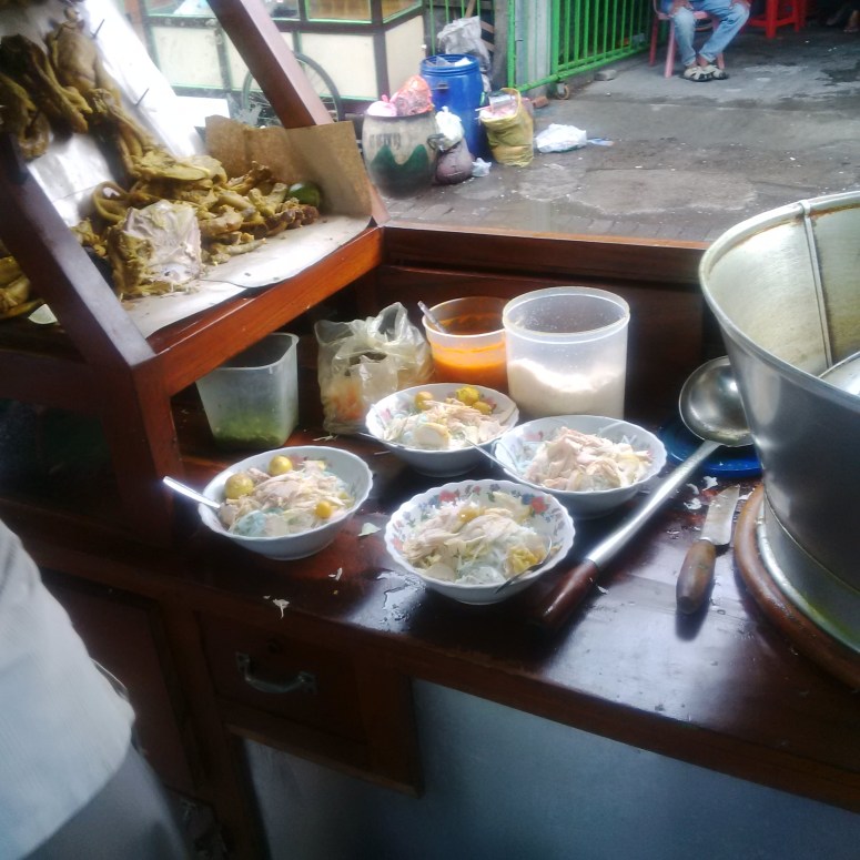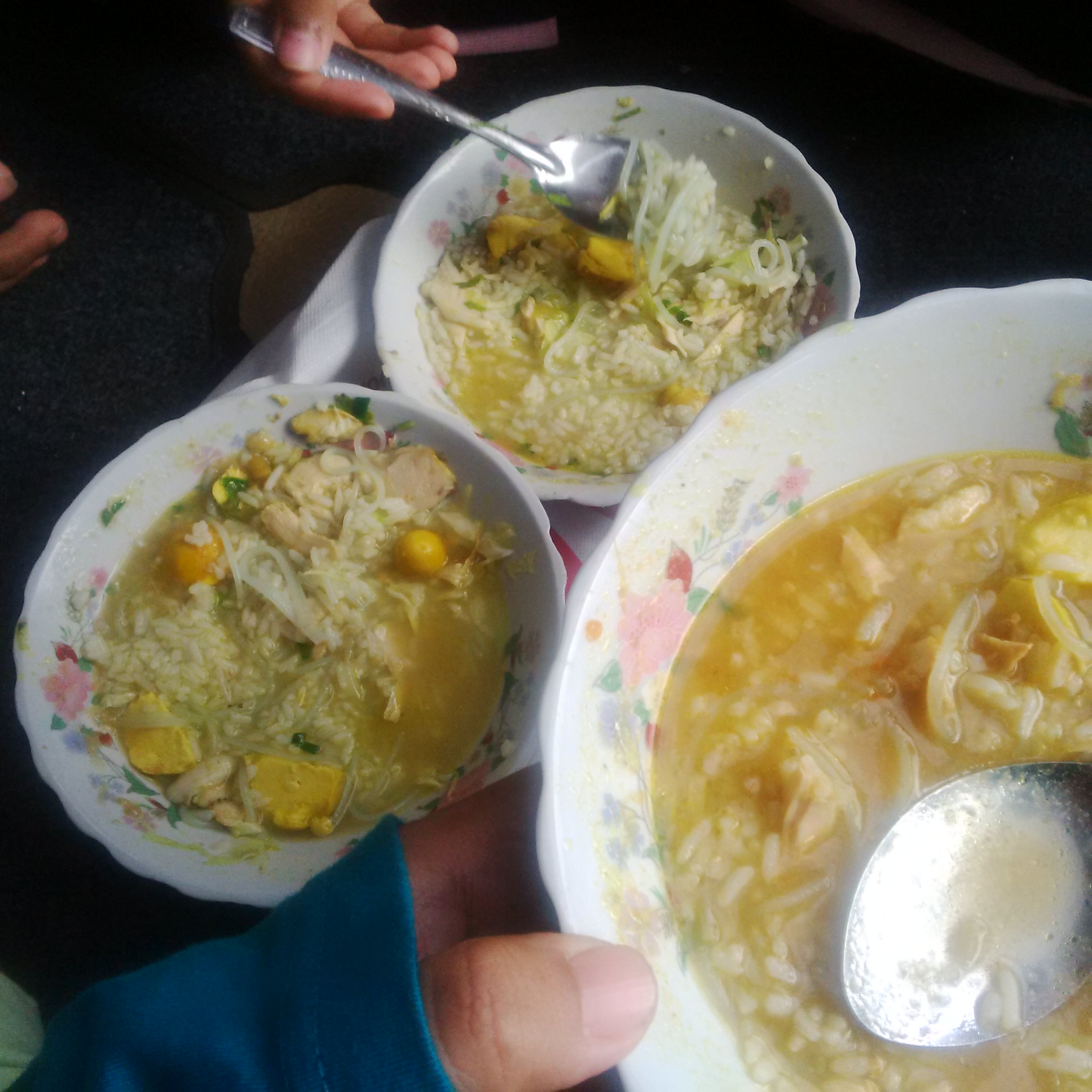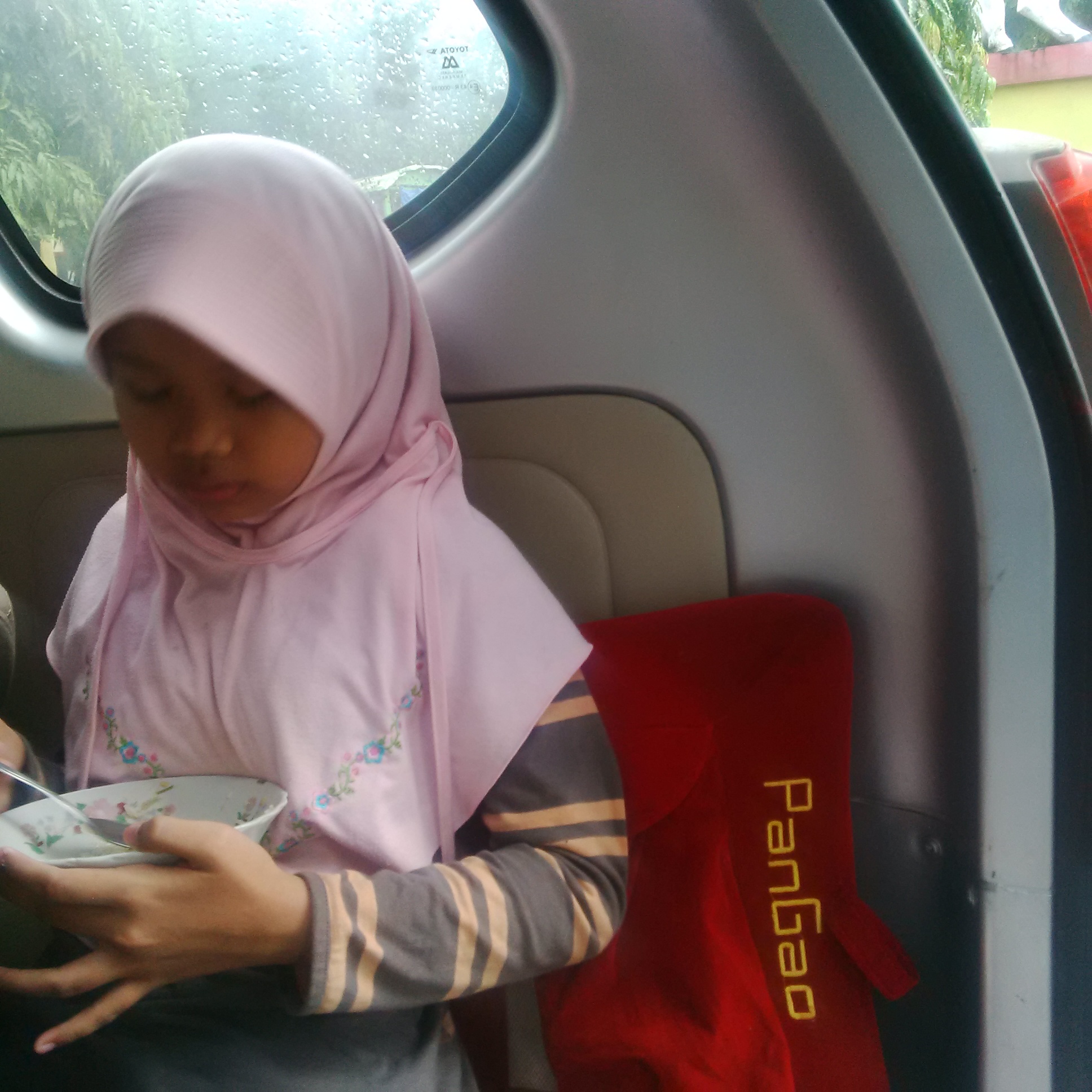Akhirnya pas hujan mulai menyisahkan rintik-rintiknya ketika jam menunjuk angka 7, disempetin keluar untuk menghirup udara segar. Sekalian maem soto di depan komplek. Lapaknya di pinggir jalan, tanpa meja. Jadi rada susah buat anak-anak saat megang mangkoknya yang pastinya panas. Jadinya lesehan di kabin mobil. Aneh aja, hal seperti itu tak urung menarik perhatian orang yang lewat ternyata.